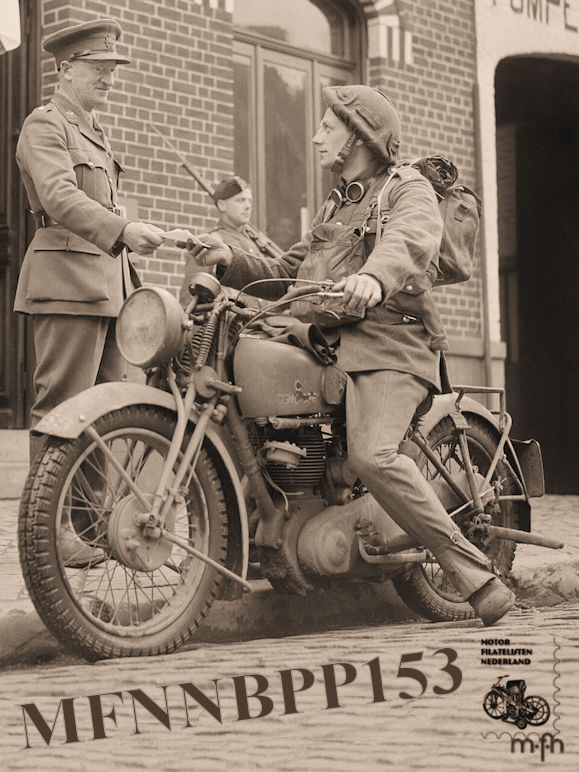 MFNNBPPZ (NB 153) Zegel gemaakt voor verzending van MFN Nieuwsbrief 153, september 2025. Op de zegel een foto van een Engelse despatch rider die een brief overhandigd aan een hogere militair.