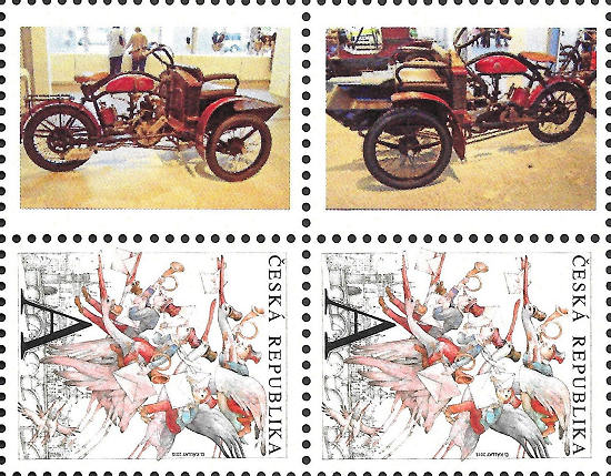 Op de laatste clubmiddag verraste Leo mij met een Sberatel (naam van een Internationale verzamelbeurs in Praag) PPZ-vel van Tsjechië met daarop een antieke voor‑zitter-3‑wiel-motorfiets. In het vel negen zegels, negen labels met 4 x en 5 x een afbeelding van de 3‑wieler, een Laurin & Klement uit 1911.