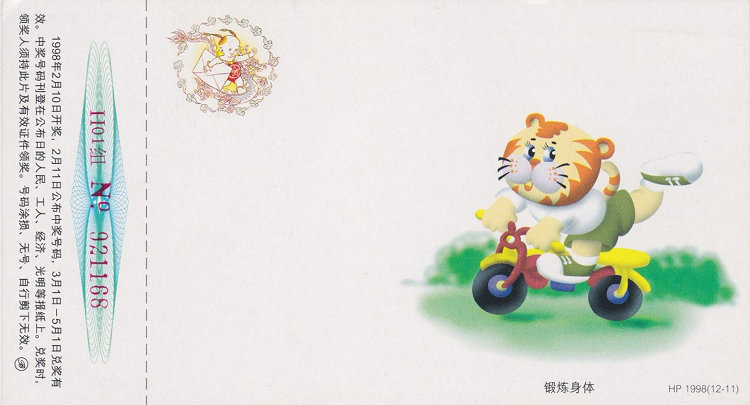 Een andere afbeelding waar ik nog wel eens een vraag over krijg, is de hieronder getoonde Chinese Loterij-briefkaart van een Tijger op een (motor)fietsachtige tweewieler. De kaart is uitgegeven als kerstkaart in 1998, in een serie met Tijgers in sportsituaties.
