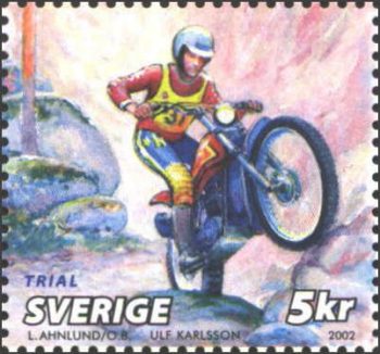 Eerste uitgifte dag 5 oktober 2002. Het is de Montesa Cota 349, gebouwd in 1979-1980, die op deze zegel is afgebeeld. De rijder is Ulf Karlsson, geboren op 6 maart 1952 in Alvangen, Zweden. Hij gaf in 1975 zijn naam aan de Montesa Cota 247 Ulf Karlsson versie. Scandinavisch kampioen in 1972, vervolgens meerdere keren Zweeds kampioen werd hij wereldkampioen in 1980 op een Montesa. |