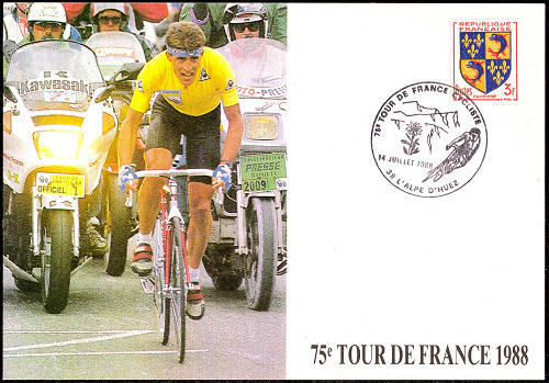 Van boven naar beneden staan de volgende renners op de zegels/blokken: Greg Lemond, Greg Lemond, Stephen Roche, Eddy Merckx, Louison Bobet, Bernard Thévenet en Bernard Hinault.